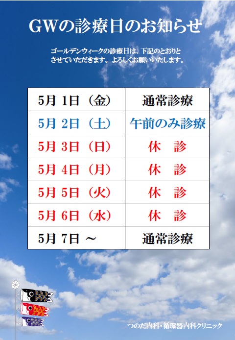 ゴールデンウィークの診療日は下記のとおりとさせていただきます。
